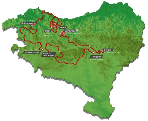 La edición de este año comienza en Zumárraga, en la provincia de Guipúzkoa, con una crono individual de 11,2 km en torno a esta localidad, incluyendo en la 2ª mitad de la CRI el muro de La Antigua, ya visto en ediciones de 2011 y 2015, aunque en etapas en línea, y que tiene 800 m finales al 15%, con puntas del 23% -> listado de rampas máximas en carrera, lo que unido al complicado descenso hace que sea una CRI para corredores explosivos y con buen dominio de la bicicleta. Al día siguiente, etapa tipo clásica, con 150 km entre Zumárraga y Gorraiz, en el Valle de Eguës (Navarra), incluyendo de inicio los puertos de Olaberría y Lizarrusti, para tras el paso por Pamplona y ya en los 60 km finales afrontar 6 tramos de «sterrato«, el último a 16 km de meta, además de varias zonas hormigonadas y subidas cortas no puntuadas, con la llegada en Gorraiz tras un repecho de 600 m al 8%, siendo un final para los «up-hill finishers». La 3ª etapa es la más larga de esta edición, con 191 km entre Sarriguren y el Santuario de Estibáliz, en la localidad alavesa de Argandoña, con los primeros 140 km de perfil quebrado, incluyendo los puertos de Goñi, Arenaza y Opakua, pero los últimos 50 km llanos … a excepción de la llegada, con 2 km al 4% hasta el Santuario, favoreciendo a los velocistas completos.