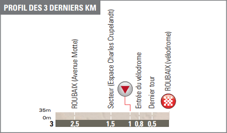 Ya en el velódromo, los corredores tendrán que dar una vuelta y media a la pista, un momento de homenaje para el ganador en caso de llegar con una clara ventaja, como Cancellara y Boonen en las ediciones de 2010 y 2012 … pero de nervios y agónico sprint final en caso de que la victoria se juegue en un pequeño grupo, como ocurrió en 2015, 2016 y 2017, con triunfos de Degenkolb, Hayman y Van Avermaet respectivamente.