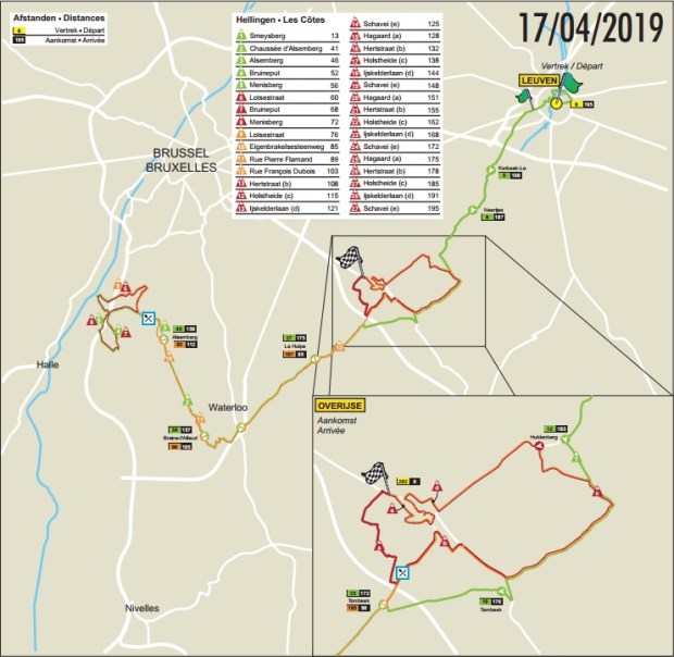 Salvo por el muro de Smeysberg, que fue la novedad en 2017, y dos repechos no marcados, los primeros 40 km de la carrera, casi siempre en dirección suroeste, son básicamente llanos, para tras el paso por el municipio de Braine-l’Alleud complicarse el recorrido, con 30 cotas durante los últimos 160 km, aunque varias de ellas repetidas en múltiples pasos. En general no son subidas duras, si bien 2 de ellas cuentan con la superficie adoquinada (Herstraat e Ijskelerlaan), pero su acumulación provoca que sea una prueba exigente y muy difícil de controlar, resultando habitualmente muy entretenida.