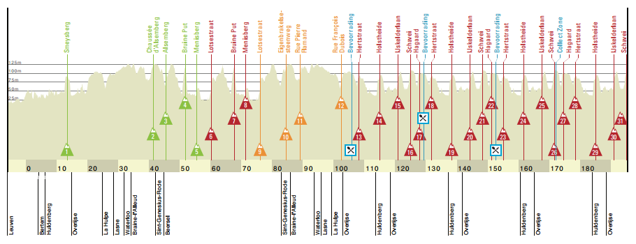 La mayor dureza se concentra en el mencionado circuito finalde 23,4 km y al que ciclistas tendrán que dar 3 vueltas y media, realizando en total tres pasos por la cota de Hagaard y cuatro por las de Hertstraat, Holstheide, Ijskelderlaan y Schavei, esta última con 700 m cercanos al 6% de media (sin contar un repecho previo) y coronándose muy cerca de meta, aunque los últimos 200 metros, tras una curva a izquierdas, son básicamente llanos, siendo normalmente decisiva para el resultado final.