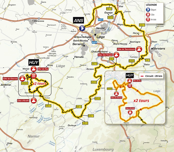 El recorrido de este año, con salida desde Ans en lugar de Seraing, tan solo incluye 2 cotas oficiales en los primeros 120 km, concentrando su dureza en la 2ª mitad de la ruta, con casi 3 vueltas al circuito final ya habitual de los últimos años, de tal modo que los corredores tedrán que realizarun triple paso por las cotas de Ereffe, Cherave y Huy en los últimos 75 km de la prueba, para un número total de cotas y kilometraje algo inferior a los de año pasado: 11 subidas y 195 km respectivamente.