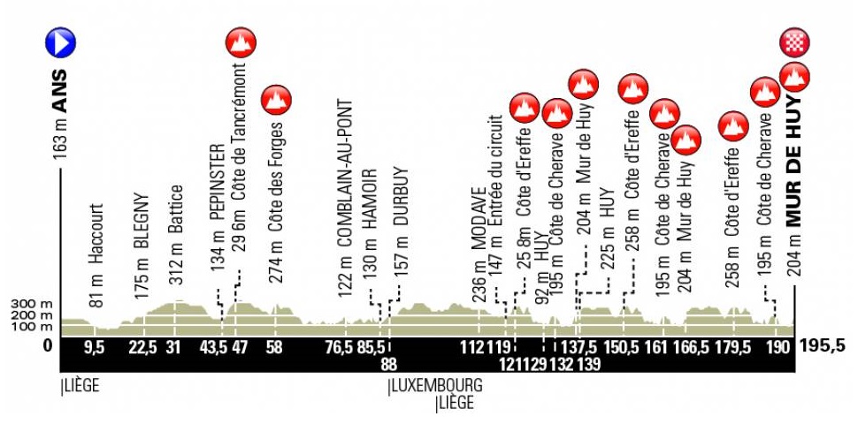 - Mur de Huy (km 137): 204 m – 1,3 km – 9,6 %