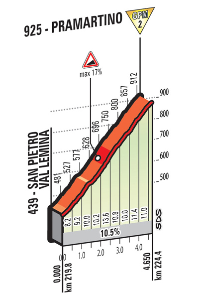 Al día siguiente, la etapa más larga, rozando los 240 km entre las localidades costeras de Tortoreto Lido y Pesaro, con una 1ª parte de la ruta muy llana, circulando junto al Adriático, pero con la 2ª mitad rompepiernas, incluyendo 3 subidas puntuables y múltiples repechos, coronando el último, Monte San Bartolo, a 6 km de meta, dando paso a un descenso muy técnico, con múltiples «tornanti», que acaba a 2,5 km de la llegada -> perfil del final. Una jornada imprevisible, pudiendo resolverse tanto con una escapada como con un sprint reducido en el pelotón. Y como cierre de la 1ª semana, una etapa clave: crono individual de 35 km entre Riccione y San Marino, con los primeros 2/3 de la ruta llanos, aunque con ligera tendencia ascendente, sobre todo a partir de la mitad de la crono, y los últimos 12 km de irregular subida hasta San Marino, alternando zonas duras, con varios tramos de 500 m al 8-9%, y descansillos e incluso 2 pequeñas bajadas, terminando con 2,2 km al 6,5%. Una CRI para corredores completos, capaces de rodar a 50 km/h en el llano y de subir luego a buen ritmo, teniendo que saber gestionar las fuerzas para no hundirse en la parte final. No obstante, aunque puede haber grandes diferencias, siendo la crono larga de esta edición se echa de menos una distancia superior, rondando los 45 km.