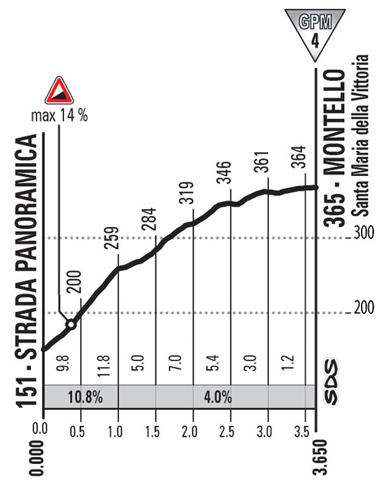 Tras su descenso, largo tramo de falsos llanos hasta Fonzaso, inicio del ascenso a Lamon, con 6 km al 4,5% y dando paso a una zona de casi 20 km que pica hacia arriba, atravesando la Val Cismon con varios túneles en busca de Fiera di Primero y la subida final a San Martino, con 11,5 km al 6,2%, sin grandes rampas pero muy regular, aunque no será fácil que se abran huecos entre los favoritos, como ya se vio en la etapa de 2009 -> vídeo con victoria de Di Luca, aunque tras su sanción recayó en Garzelli, y más de 30 corredores en 15 segundos. También hubo llegadas en 1954, ganando Wagtsmans, y 1982, con triunfo de Vicente Belda.