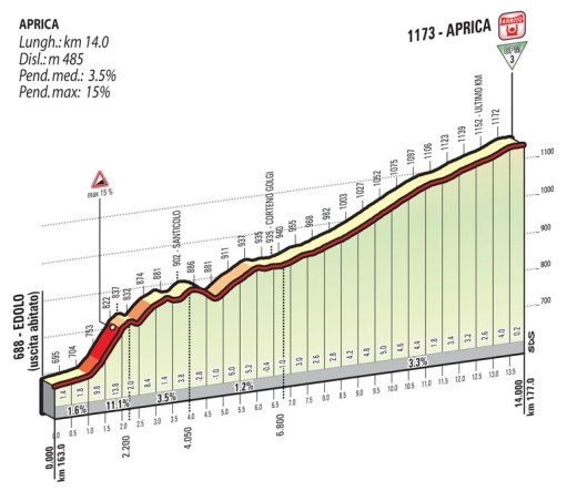 Una vez coronado Salven, largo descenso hacia Malogno y Breno, dando paso a casi 20 km llanos, aunque con ligera tendencia ascendente, en busca del inédito ascenso a Cevo, que cuenta con 10,5 km al 6% de media y una fuerte bajada hacia Forno Allione, ya en las cercanías de Edolo, localidad donde se inicia el ascenso a Aprica, afrontándose por la variante de Santicolo, estrenada en 2010 y que tiene un km inicial al 12% seguido por varios repechos antes de unirse a la ctra. principal a 7 km de la cima, ya de tendida subida al 3-4%. Y ojo a la bajada, muy técnica en su 2ª mitad, en busca de Tirano, con repecho incluído, y el pueblo Mazzo.