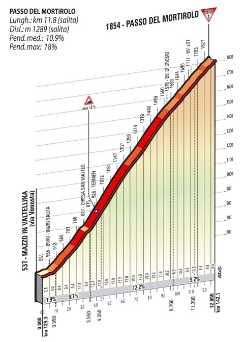 - Passo del Mortirolo, 1ª (km 166,3): 1.854 m