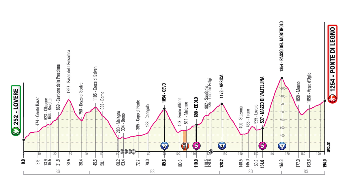 En este último donde se inicia la subida al mítico Mortirolo, el puerto más decisivo del Giro las últimas décadas y que con 12 km al 10,8% de media y un coeficiente APM de 480 está en el top-10 de puertos más duros en carrera. Una vez coronado, a 28 km de meta, fuerte descenso hasta llegar a la vía principal, donde en lugar de volver hacia Aprica, como se hacía otros años, se irá hacia el este en busca de Ponte di Legno, si bien las características de este tramo son similares a la vertiente clásica: 15 km al 2-3%, incluyendo 4 km iniciales al 4,2%, pero que con la carrera rota y el desgaste previo puede hacer mucho daño, ampliando diferencias.