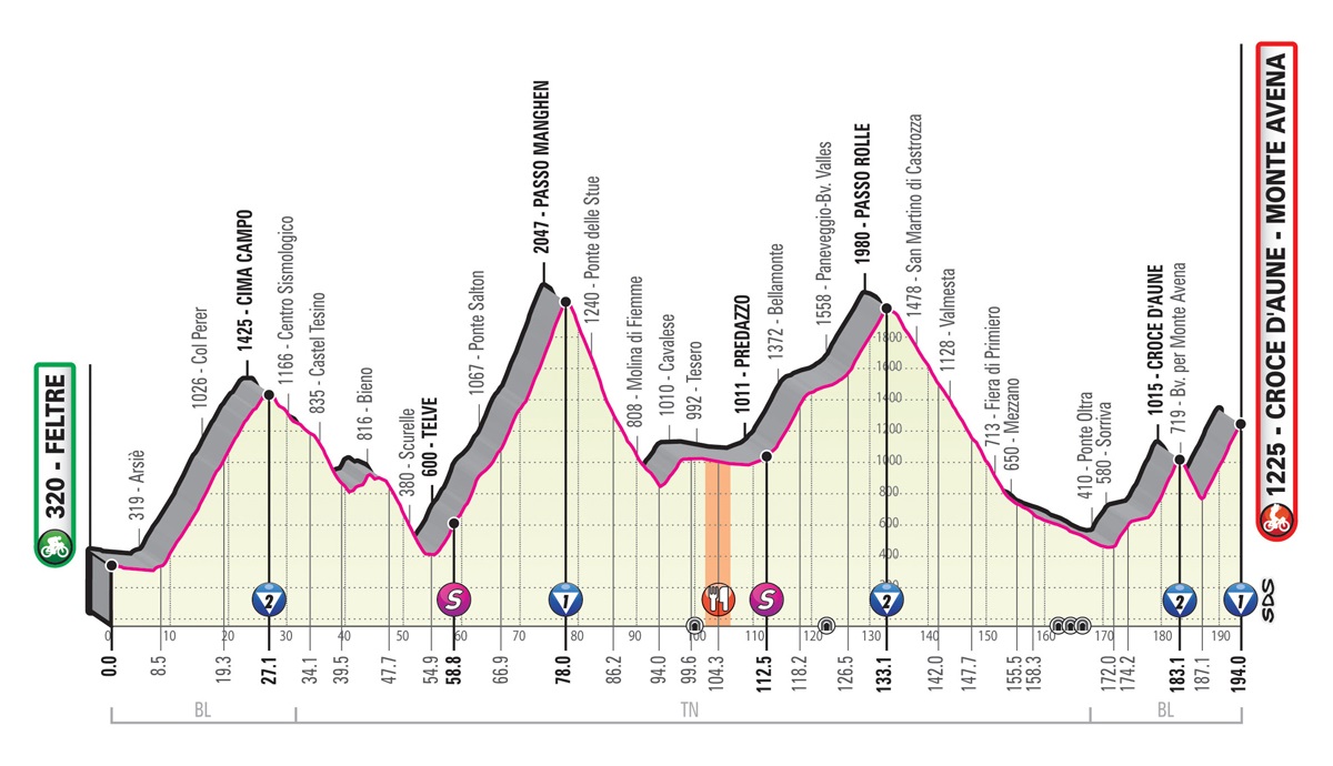 En definitiva, una etapa durísima, si bien su desarrollo es impredecible, pudiendo liarse de salida, en Manghen o que los favoritos se reserven para el enlazado final, donde en cualquier caso debería notarse el desgaste previo, marcando diferencias. Señalar que la ruta presentada inicialmente tenía una subida final distinta, con Monte Avena por Croce d’Aune sin descenso intermedio, alcanzando la cota más alta tras 2 km al 10% y con un último km antes de meta de bajada por pista de tierra, siendo muy posible que éste haya sido el motivo del cambio, aunque no ha habido explicación oficial.
