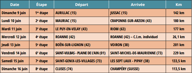El recorrido de este año es bastante novedoso, iniciándose con 2 etapas de media montaña en el Macizo Central, la 1ª uniendo Aurillac con Jussac, afrontando de salida el ascenso a Peyrol / Puy Mary, para ya en la parte final dar (casi) 2 vueltas a un circuito que incluye la cota de Roquenatou, con unas cifras de 3,6 km al 7 % y coronándose a 18 km de la meta en Jussac en el último paso; y la segunda con 180 km entre las localidades de Mauriac y Craponne sur Arzon, con un perfil muy quebrado durante los primeros 70 km, incluyendo 6 cotas, y los últimos 55, con 3 subidas puntuables, destacando el muro de St. Victor sur Arlanc, con algo más de 3 km al 9,5%, estando también la cima a 18 de meta, pudiendo destrozar el grupo. Dos jornadas muy interesantes, con terreno inicial complicado (ojo a la posibilidad de fuga-bidón) y un último puerto con cierta dureza, sobre todo camino de Craponne sur Arlanc, donde poder ver ataques importantes. La 3ª etapa tiene una ruta más sencilla, con 177 km entre Le Puy en Velay y Riom, en el departamento de Puy de Dôme, incluyendo varias cotas pero de escasa dureza y muy lejos de meta, siendo una jornada para los sprinters.