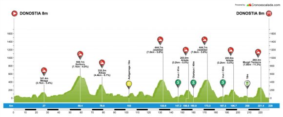 En definitiva, un recorrido muy exigente, tanto por el elevado kilometraje, casi 230 km, como por los puertos a superar, con la buena noticia de la recuperación de Erlaitz y las 3 últimas subidas incluyendo tramos muy duros, pero con mal encadenado final, habiendo mucho llano intermedio y con una última subida tipo muro que perjudica la batalla desde lejos, provocando que tanto Jaizkibel como Erlaitz, e incluso puede que el primer paso por Murgil, queden solamente como desgaste, con los favoritos esperando a la última subida para moverse.