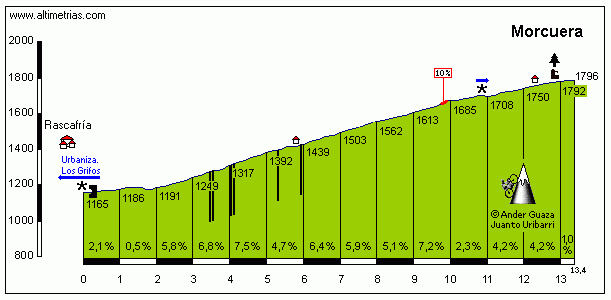 - Puerto de la Morcuera N, 1ª (km 78,2): 1.795 m – 13,2 km – 5 %