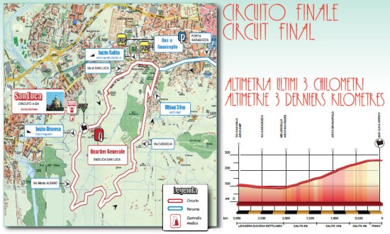 - San Luca -5 pasos- (km 170,2 / 179,5 / 188,8 / 198,1 / Meta): 268 m – 2,1 km – 10%