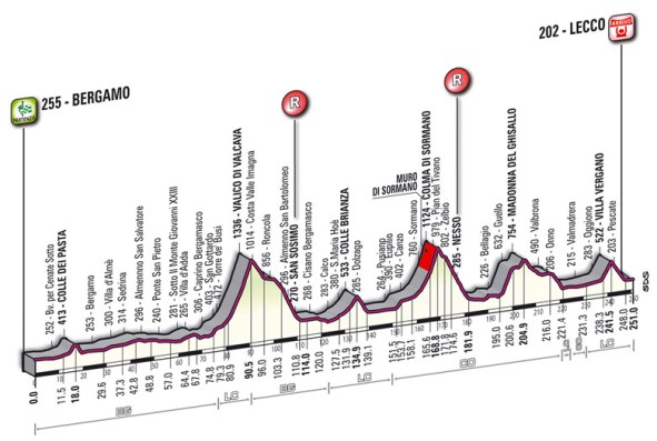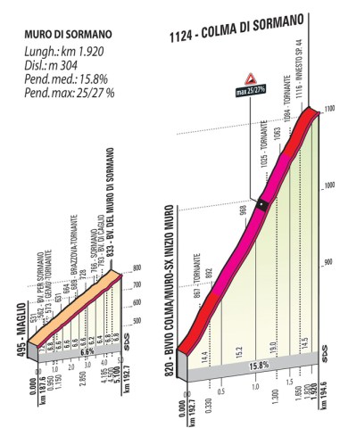 Coronado el Ghisallo, a 64 km de meta, suave descenso (hasta el km 6,5) en busca del Maglio y el inicio de la Colma di Sormano, una subida que tal y como se hará en esta edición se puede dividir en 2 partes muy diferentes: un primer tramo de 5 km regular al 6-7%, por una carretera plagada de “herraduras” aunque en buenas condiciones; y una parte final brutal, donde tras un desvío se afronta el famoso Muro de Sormano, con 1,8 km al 16,3% y puntas de hasta el 27% antes de regresar a la vía principal -> perfil / fotos, estando muy arriba en las listas tanto de rampas máximas como de km más duros superados en carrera. Y por su distancia a meta, menos de 50 km, pudiendo resultar clave en el desarrollo de la prueba, provocando una gran selección a poco que el ritmo sea elevado.