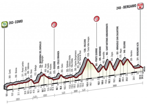 El trazado de 2016 siguió la ruta inversa a la edición previa, saliendo de Como y con la llegada en Bérgamo, al igual que en 2014 … pero con un recorrido intermedio muy distinto, siendo el más duro en la historia de la prueba al tener que superar 8 puertos, 6 de ellos en la 2ª mitad de la ruta, destacando el encadenado de Valcava, que se recuperaba tras 2 años ausente, Berbenno, el inédito San Antonio Abbandonato, con 6 km al 9,5%, Miragolo S.Salvatore, 6 km finales a casi el 8%, y Selvino antes del llano previo a la cota de Bérgamo Alta, a sólo 3,5 km de meta, acumulándose unos 4500 m de desnivel. Y los corredores estuvieron a la altura, viéndose una gran carrera, con batalla desde lejos y el mencionado triunfo de Chaves tras superar a Rosa y Urán en el sprint final.