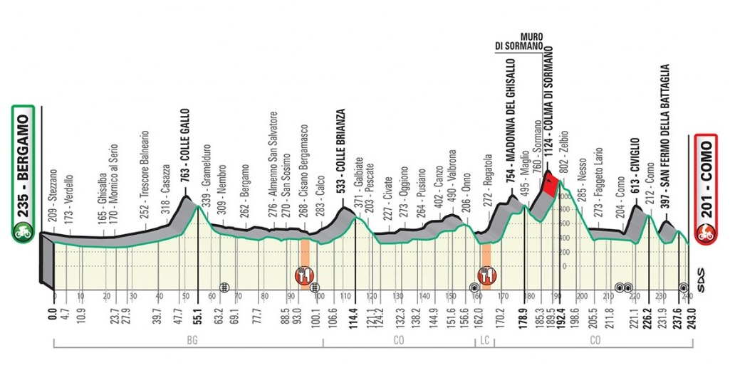 Como decíamos al inicio, el recorrido de este año recupera San Fermo, tras las obras que impidieron su paso en 2018, lo que hace que sea casi idéntico al de 2015 y 2017, repitiendo las localidades de salida y llegada, Bérgamo y Como respectivamente, así como todos los puertos, subiéndose además por la misma vertiente, destacando los míticos Madonna del Ghisallo y Muro de Sormano antes del encadenado de Civiglio + San Fermo, variando sólo un tramo de la parte central de la ruta, de tal modo que el kilometraje es ligeramente inferior al de hace 2 años, para una distancia total de 243 km.