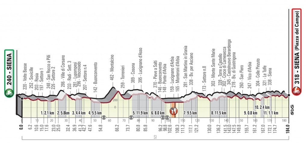 Tras un comienzo llano en dirección suroeste, pronto llegará el primer sector de sterrato, Vidritta, afrontando poco después Bagnaia, con una dura subida sobre tierra, Grotti, que incluye pendientes del 10%. Una vez coronado, descenso sobre asfalto en busca del sector de Radi, que algunos años ha sido la primera zona de sterrato, llegando a continuación Murlo, un tramo relativamente largo (5,5 km) pero con tendencia favorable, regresando al asfalto en las cercanías de Buonconvento y la cota de Montalcino, con unos 6 km al 5% de media. Esta localidad saltó a la fama con la gran etapa del Giro 2010 -> vídeo, con triunfo de Evans, si bien hay que aclarar que se llegaba a Montalcino por una carretera distinta, teniendo que afrontar la dura subida al Poggio Civitella, con muchos km sin asfaltar y largas zonas por encima del 10%.