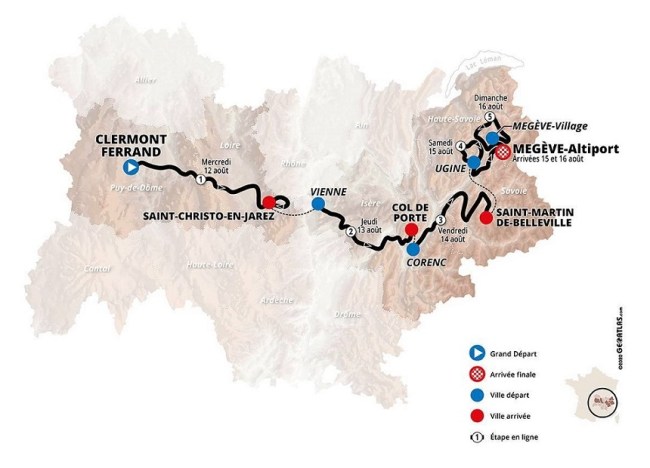 Como decíamos al inicio, la mayor novedad en el recorrido final de este año es la reducción de etapas, pasando de 8 a 5, con los organizadores habiendo tomado esta decisión por su nueva ubicación en el calendario, en pleno mes de agosto, un cambio de fechas provocado por la pandemia que tuvo el ciclismo paralizado durante 4 meses. De hecho, en el trazado que se anunció originalmente, que iba a disputarse del 31 de mayo al 7 de junio, sí había 8 etapas, habiéndose eliminado para el definitivo la jornada de St. Vallier, tipo clásica, y Bourg en Péage, la única para sprinters, además de convertir las 2 primeras en una sola al combinar la salida de Clermont Ferrand con la llegada en St .Christo en Jarez, en vez de la meta en Lyon, con 2 cotas en la parte final, y el inicio de St. Germain au Mont d’Or respectivamente.