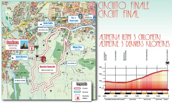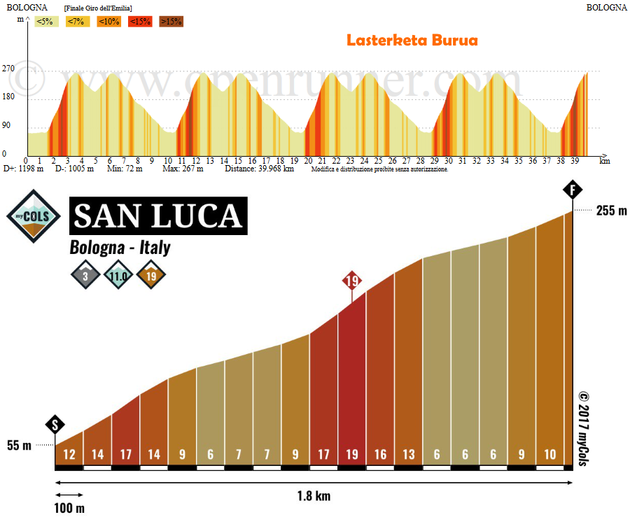 Una vez coronado Brasimone, giro hacia el norte para afrontar un largo e irregular descenso, dando paso a un falso llano favorable previo al Válico Ganzole, corto pero duro, con algo más de 2 km rondando el 9%. Tras su bajada y unos 15 km llanos, ya en las cercanías de Bologna, se darán 4 vueltas y media al habitual circuito final, de 9,3 km y con el Santuario de San Luca como gran dificultad -> perfil Salite, subida que con 2 km al 10%, aunque muy irregulares, y rampas del 18% irá seleccionando el grupo hasta llegar al último ascenso, donde normalmente se decide el ganador de esta clásica, aunque eso sí, ojo también al repecho que hay tras coronar y al propio descenso, sobre todo si llueve.