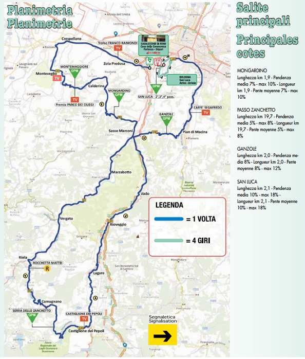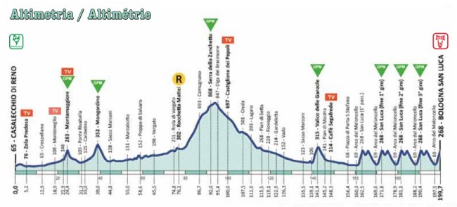 Como decíamos al inicio, el trazado de este año es algo distinto a las últimas ediciones, al menos parte de la ruta, ya que el final si es el clásico, con los 5 pasos por San Luca, para una distancia total de 200 km según rutómetro (sin contar la neutralizada). Con salida desde Casalecchio di Reno, a las afueras de Bologna, la prueba se inicia con un rodeo al oeste de la ciudad de Bologna, afrontando las cotas de Montemaggiore y Mongardino, ambas de unos 2 km, la 1ª con buenas rampas, antes de dirigirse definitivamente hacia el sur en busca del Passo del Zanchetto, con unos 11 km al 5% de media, a lo que habría que sumar el tramo hasta el Passo Brasimone, a casi 900 m de altitud.