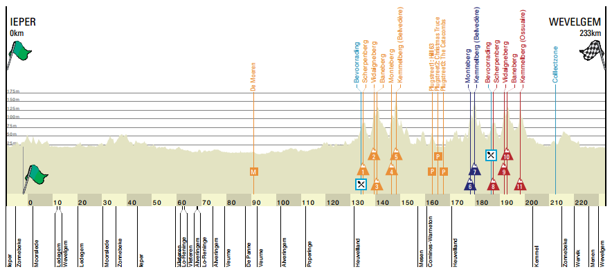 Superados los Plugstreets, ya en los 70 km finales, hpequeño llano antes de repetir el encadenado de Monteberg y Kemmelberg (por Belvedere), afrontando también por 2ª vez la secuencia de cotas de Scherpenberg, Vidaigneberg y Baneberg, con 300 m finales al 9-10%, antes de encarar la vertiente más dura del Kemmelberg, que incluyendo 500 m finales a casi el 12% de media -> perfil detallado, y la superficie adoquinada puede destrozar el pelotón a poco que el ritmo sea elevado, como ya ocurrió en varias de las últimas ediciones.