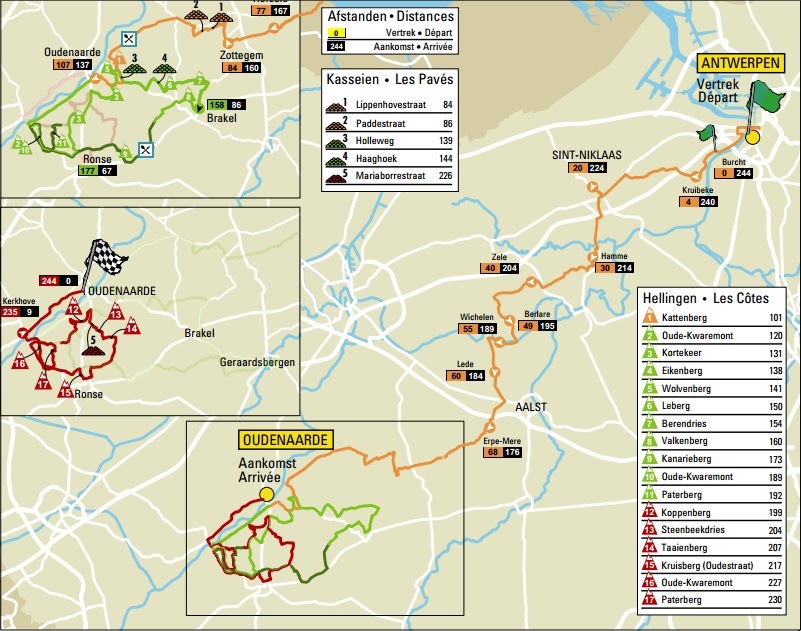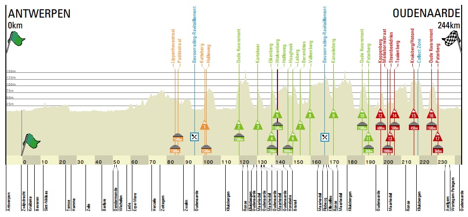 De este modo, la prueba comenzará en la mencionada localidad de Amberes, capital de la provincia homónima, siguiendo una ruta casi siempre en dirección suroeste durante los primeros 100 km, en busca del primer paso por Oudenaarde, ya en la provincia de Flandes Oriental, con los sectores de pavé llanos de Lippenhovestraat y Paddestraat, ambos rondando el km y medio, como dificultades principales, aunque como siempre ojo también a las posibles caídas y montoneras en zonas aparentemente más sencillas, que en anteriores ediciones ya afectaron a varios de los favoritos, así como al viento, que si sopla de costado podría generar abanicos.