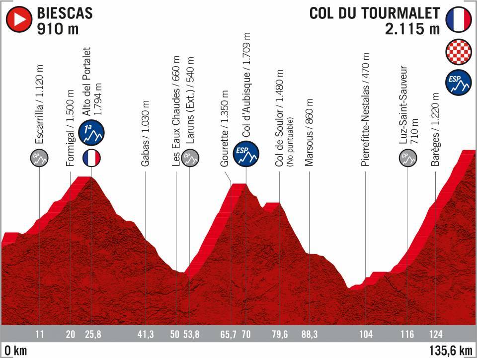 En vísperas de la jornada de descanso, etapa de montaña de casi 150 km entre Biescas y la estación de esquí de Aramón Formigal, realizando 2 vueltas a un circuito en torno a Sabiñanigo, con repecho incluído, antes de otro bucle, ya más largo, alrededor del propio Biescas y con los puertos de Petralba, en sentido contrario a la etapa previa, y Cotefablo, de 2ª categoría por su longitud, aunque sin rampa duras. Tras el descenso de este último se abandona el bucle, tomando dirección norte en busca de la subida a Formigal, larga pero bastante irregular, con 15 km al 4,7% (sin contar el repecho inicial hasta la presa de Bubal), destacando, tras abandonar la carretera del Portalet, los 3,8 km finales al 6-7% hasta la meta en el párking de Los Sarrios, haciéndose más duros de lo que indican las cifras.