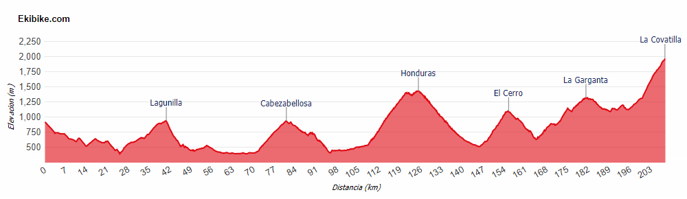 Y como último oportunidad para los escaladores, una etapa de casi 180 km entre Sequeros y la estación de esquí de La Covatilla, en las cercanías de Béjar. El recorrido es un sube y baja constante, realizando un bucle en la parte inicial con el Portillo de las Batuecas, esta vez sí por su vertiente dura, con 10 km a casi el 7% y muy escénico, yendo después hacia el este en busca de San Miguel de Valero y a continuación Cristóbal, marcados de 3ª, para ya en los últimos 50 km, pasado Montemayor, afrontar encadenado de Peñacaballera, con 5 km al 5%, y La Garganta, con 10 km al 5-6% antes del falso llano de la cima, habiéndose reasfaltado hace poco. Después su bajada y la travesia por el bonito pueblo de El Candelario, con un duro repecho adoquinado, se iniciará la dura subida final a La Covatilla (desde km 8), con últimos 8 km teniendo 8% -> perfil detallado / gráfico y fotos, incluyendo una zona de 4 km a más del 10% antes del irregular tramo final, donde se alternan rampas duras y descansillos, por una carretera ancha y muy expuesta al viento, que suele soplar con fuerza y además de cara.