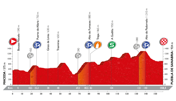 La jornada 15ª, entre Mos y Puebla de Sanabria, en Zamora, es la etapa más larga de esta Vuelta, con 230 km y un perfil muy quebrado, acercándose a los 4000 m de desnivel gracias a sus múltiples pequeños puertos, incluyendo en la 1ª mitad de la ruta la subida «en escalera» a Carcedo por San Amaro, marcada como 2 puertos, y el Alto de Forriolo, con 5 km iniciales al 7%. Después de un tramo llano, con paso por Ginzo de Limia (km 110 de la ruta), se encadenan Estivadas; no puntuable; Fumaces, con 11 km al 4-5%; A Canda por A Gudiña, que tampoco está marcado, y Padornelo -> perfil completo, con 7 km finales al 4-5%, coronándose a menos de 20 km de la meta en Sanabria, que pica hacia arriba. Una jornada impredecible, donde puede pasar de todo si hay ganas de batalla … o quedar para fuga consentida si los equipos de los favoritos prefieren reservar fuerzas. En 2016 hubo una etapa con los 120 km finales idénticos -> clasificación / vídeo, si bien llegaba en la 1ª semana y era mucho más corta, decidiéndose al sprint con triunfo para Van Genechten.