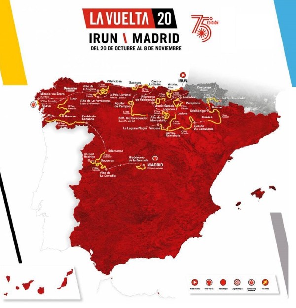 Sin embargo, tras el nuevo calendario se canceló la salida prevista, eliminando las 3 primeras jornadas e iniciando en su lugar la prueba en Irún, que originalmente era el inicio de la 4ª etapa, además de suprimirse el paso por Portugal, cambiando el trazado de esas 2 jornadas, y por Francia, sustituyendo la etapa con final en el Tourmalet por una jornada de montaña en Huesca. De este modo, una Vuelta que inicialmente tenía 21 etapas, visitando 4 paises, se redujo a 18 etapas y una ruta íntegramente española … aunque no por ello más blanda, siendo un recorrido exigente por la cantidad de jornadas quebradas.