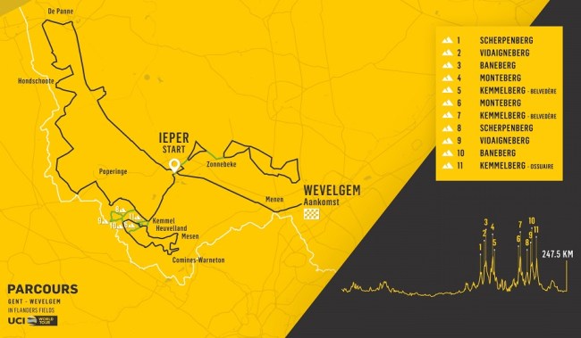 Superados los Plugstreets, ya en los 70 km finales, pequeño llano antes de repetir el encadenado de Monteberg y Kemmelberg (por Belvedere), afrontando también por 2ª vez la secuencia de cotas de Scherpenberg, Vidaigneberg y Baneberg, con 300 m finales al 9-10%, antes de encarar la vertiente más dura del Kemmelberg, que incluyendo 500 m finales a casi el 12% de media -> perfil detallado, y ese tramo doquinado puede destrozar el pelotón a poco que el ritmo sea elevado, como ha ocurrido en varias de las últimas ediciones.