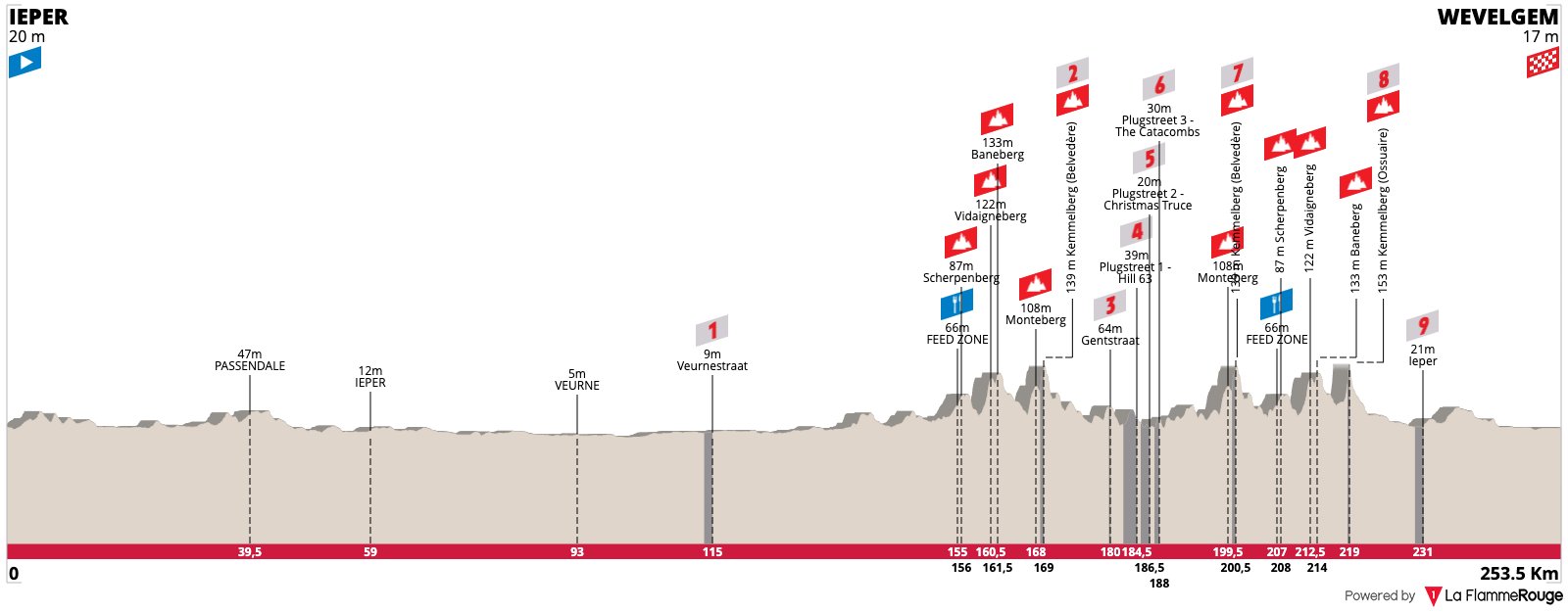 Superados los Plugstreets, ya en los 70 km finales, pequeño llano antes de repetir el encadenado de Monteberg y Kemmelberg (por Belvedere), afrontando también por 2ª vez la secuencia de cotas de Scherpenberg, Vidaigneberg y Baneberg, con 300 m finales al 9-10%, antes de encarar la vertiente más dura del Kemmelberg, que incluyendo 500 m finales a casi el 12% de media -> perfil detallado, y ese tramo doquinado puede destrozar el pelotón a poco que el ritmo sea elevado, como ha ocurrido en varias de las últimas ediciones.