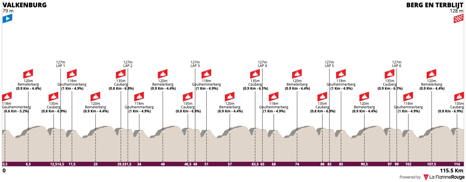 - Cauberg (12 pasos): 140 m – 1,2 km – 5,8 %