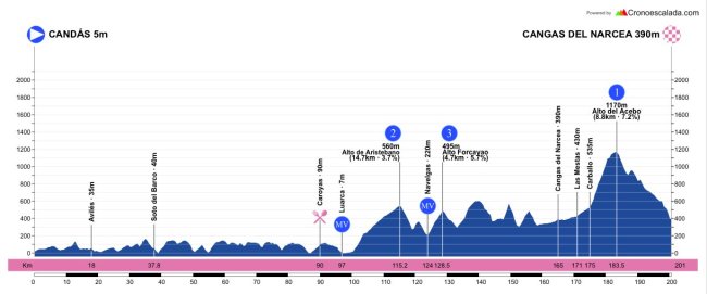 2ª ETAPA (Sábado 1 Mayo): CANDÁS – CANGAS DEL NARCEA (200,5 km). Info en la web / Rutómetro / Mapa salida – llegada