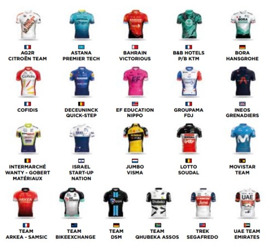 En total, serán de la partida 21 equipos, los 19 World Tour y 2 Continentales Profesionales, completando un pelotón de 147 corredores, 14 menos que en la pasada edición, cuando de un modo excepcional se permitió participar a 23 equipos.