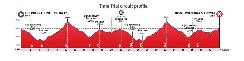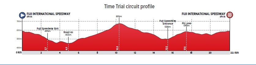 El recorrido de la prueba, con 234 km (más si se incluye la neutralizada) entre Musashinonomori Park y el circuito de Fuji Speedway, se puede dividir en 4 partes: una primera «en línea» hasta llegar a las cercanías del mencionado circuito, destacando el ascenso a Doushi Road y el primer paso por Kagosaka; un bucle alrededor de Fuji Sanroku, vertiente sur del Monte Fuji que cuenta con 14,5 km al 6% de media; una vuelta y media en torno al circuito Fuji Speedway, de sube y baja constante; y el bucle con Mikuni Pass, la subida más dura de la prueba con casi 7 km a más del 10%, y el 2º paso por Kagosaka, con su descenso llevando de nuevo al circuito final, con media vuelta hasta alcanzar la meta.
