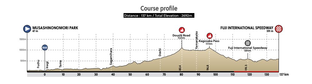 Globalmente, un trazado muy duro, con buen kilometraje y una orografía muy complicada, combinando grandes puertos como Monte Fuji y Mikuni Pass con un terreno de valle plagado de repechos, acumulando unos 4800 m desnivel. Si a eso se une el calor y la altísima humedad que hay en la zona el resultado puede ser una escabechina, siendo además una carrera muy difícil de controlar debido al reducido nº de corredores por equipo, con 5 como máximo (la mayoría de selecciones menos) y la ausencia de pinganillos, ganando importancia la lectura de carrera por parte de los ciclistas, así como la valentía para anticiparse a los rivales. En definitiva, todo apunta a un carrerón.