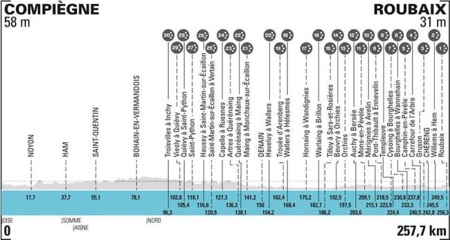 En cuanto del recorrido de la carrera masculina, es muy similar al de las últimas ediciones, si bien añadiendo un sector más de pavé, con 30 tramos adoquinados que suman 55 km sobre esta superficie, para una distancia total de 258 km. Por otro lado, señalar la previsión de lluvia, algo que no ocurre en esta prueba desde hace casi 20 años, aunque sí en la etapa de Arenberg del Tour 2014, y que va a endurecer mucho la carrera, con los charcos y el barro complicando el paso por el pavé, que en la zonas descubiertas estará muy deslizante..