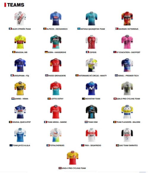 Como siempre en esta carrera, la participación es de mucho nivel, con a la mayoría de grandes “pedruscómanos” en activo, aunque curiosamente sin 2 de los 3 últimos ganadores, Colbrelli y Gilbert, al haberse retirado. A priori, todo apunta a un duelo entre Mathieu Van der Poel, podio en 2021 y que viene de ganar San Remo y ser 2º en Flandes, y el equipo Jumbo, con Wout Van Aert a la cabeza, teniendo también las bazas de Dylan Van Baarle, vencedor el año pasado, y Christophe Laporte, ganador de Gante-Wevelgem y A Través de Flandes. No obstante, ojo también a Mads Pedersen, Kasper Asgreen, Stefan Küng, Filippo Ganna … En total, serán de la partida 25 equipos: los 18 de categoría World Team y 7 Pro Team, completando un pelotón de 175 corredores.