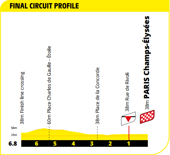 Después de los Vosgos, traslado hasta París para la clásica etapa final con múltiples pasos por el circuito de los Campos Elíseos -> perfil, que se estrenó como llegada en la mítica edición de 1975. En este caso con salida desde St. Quentin en Yvelines, al oeste de la capital, y un total de 115 km, con 8 vueltas completas al circuito de años anteriores, que cuenta con una recta final de 700 m. Un día muy favorable para los velocistas, ganando Van Aert en 2021 (vídeo) y Philipsen en 2022 (vídeo), teniendo que remontarse a 2005 para ver triunfar un ataque, cuando lo logró Vinokourov, y que servirá de homenaje para todos los ciclistas que consigan terminar la prueba.