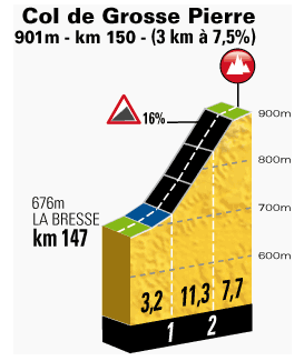 Y como último día de montaña, etapa corta pero dura en los Vosgos, con 134 km entre Belfort y Le Markstein Fellering, incluyendo 6 subidas puntuables. De inicio, el mítico Ballon d’Alsace, aunque por su vertiente suave, para tras el descenso y el tendido repecho de Menil afrontar un encadenado de 4 puertos: Croix des Moinats por vertiente sur, con 5,2 km al 7%; Grosse Pierre (falta el final), que tiene un tramo de 1,3 km al 11%; Col des Feiges, no puntuado; y el Col de la Schlucht (desde cruce Feignes), con 2,7 km iniciales al 7,5%. Su largo aunque tendido descenso acaba en Munster, inicio del puerto más exigente del día: Le Petit Ballon, con 9,3 km a más del 8% y cuya bajada (hasta km 11) enlaza perfecto con el Col du Platzerwasel, oficialmente 7,1 km al 8,4%, el último al 10,5%, pero cuya subida continúa durante 3 km hasta Le Breitfirst, coronándose a solo 5 km de meta, con un falso llano favorable hasta Le Markstein.