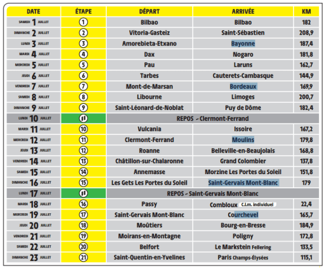 Como decíamos en el artículo previo, se trata de la 110ª edición del Tour, la 2ª con inicio desde España al salir desde Bilbao, en el País Vasco, el día 1 de julio, terminando con el clásico final en los Campos Elíseos de París el día 23 del mismo mes, ya con sus fechas habituales tras los cambios que hubo en ediciones recientes debido a la pandemia del coronavirus.