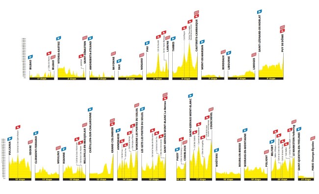 Como es habitual, la prueba consta de 21 etapas, con 2 días de descanso intercalados, clasificándose oficialmente en 8 jornadas llanas, aunque la mitad de ellas en realidad son quebradas; 4 de media montaña, si bien algunas de las encuadradas en las otras categorías también encajarían aquí; y 8 de alta montaña, incluyendo las 5 cordilleras, aunque las del Macizo Central y Jura son más bien media montaña con final en alto; y una contrarreloj, que además no llega hasta la 3ª semana. En total, 3.409 km sin contar neutralizaciones.