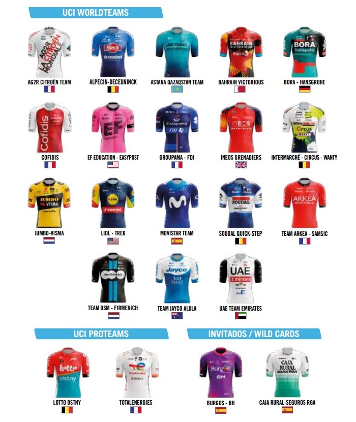 El equipo a batir es Jumbo-Visma, que tiene a Primoz Roglic, triple vencedor de la prueba, y Jonas Vingegaard, doble ganador del Tour, como candidatos, además de gregarios fortísimos, como Kuss y Kelderman. Intentarán ponérselo difícil Soudal, con Remco Evenepoel, vigente ganador; UAE, con la doble baza de Juan Ayuso, 3º el año pasado, y Joao Almeida, podio en el Giro, además de Jay Vine; Ineos, que tiene a Geraint Thomas, 2º en la «corsa rosa», Thymen Arensman y Egan Bernal; y Movistar, con Enric Mas, tres veces 2º, y Einer Rubio. Otros corredores con opciones; Alexandr Vlasov, Emanuel Buchmann y Lennard Kamna (Bora); Mikel Landa, Damiano Caruso y Saintiago Buitrago (Bahrain); Romain Bardet (DSM); Hugh Carty (EF); Eddie Dunbar (Jayco); y los jóvenes de FDJ, Lenny Martínez y Roman Gregoire.