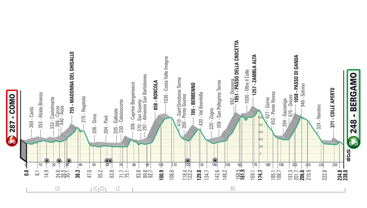 Como decíamos al inicio, el trazado de este año es el mismo de 2021, con casi 240 km entre Como, final más habitual de la prueba en los últimos años, y Bérgamo, teniendo un recorrido de media montaña con 7 subidas oficiales (más la cota de San Gottardo), destacando Roncola, Dossena/Crocetta y Passo Ganda, este último a priori la clave de la prueba, con 2,5 km finales al 10% y coronándose a 31,5 km de meta, con la revirada bajada por Selvino antes de 10 km llanos y la cota adoquinada de Colle Aperto / Bergamo Alta, a poco más de 3 km de la llegada. En total, unos 4500 m de desnivel acumulado, algo menos que en 2022 pero siendo en cualquier caso una ruta exigente.