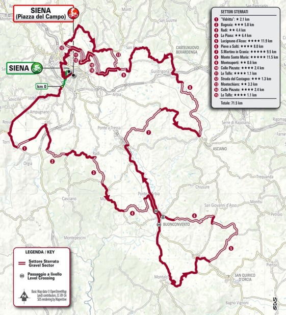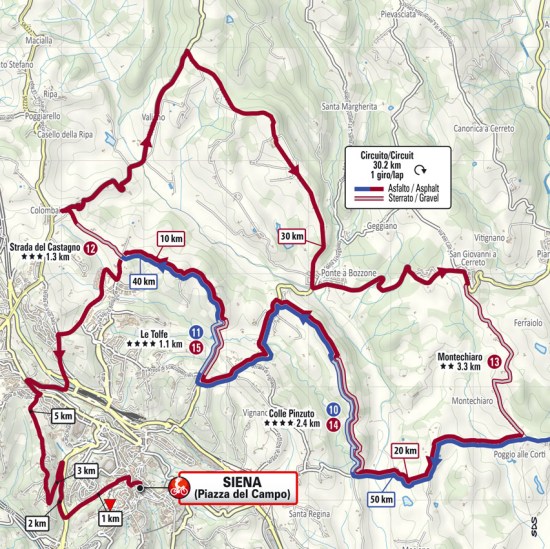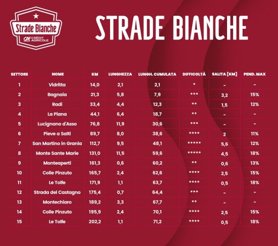 Como decíamos al inicio, el trazado de este año es el más exigente en la historia de la carrera, ya que a la ruta de ediciones anteriores se ha añadido un bucle cerca de Siena, añadiendo dos sectores de tierra, Strada del Castagno y Montechiaro, además de un buen repecho sobre asfalto, y realizando dos veces los tramos de Colle Pinzuto y Le Tolfe, lo que que hace que la distancia total aumente en 30 km, llegando a los 215 km, mientras que los tramos de «sterrato» pasan de 11 a 15, sumando nada menos que 71 km sin asfaltar, un tercio de la prueba. Y ojo a la previsión de lluvia, que puede endurecer aún más la carrera.