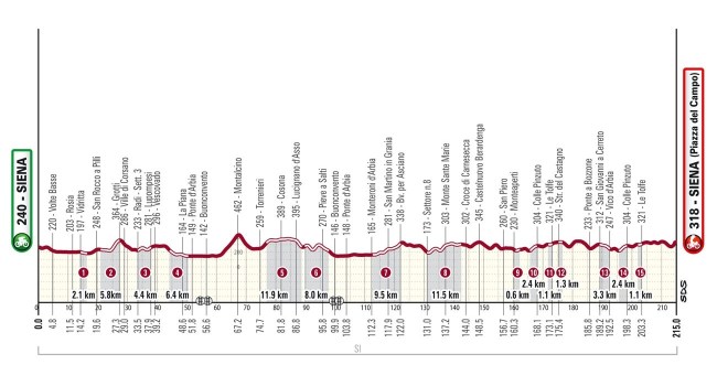 Después de Montechiaro, a 20 km de meta, se retomará la ruta habitual para hacer el 2º paso por Colle Pinzuto y Le Tolfe, donde la carrera ya debería ir totalmente rota, si bien retando aún 12 km para el final, con terreno ondulado antes de llegar a Siena, donde los corredores afrontarán el muro de Santa Caterina, con 500 m al 12,4% y puntas del 16% (oficialmente, según otras fuentes alcanza el 20%), acabando la subida poco antes de la Piazza del Campo, muy escénica y donde volverá a estar situada la meta tras un corto descenso.
