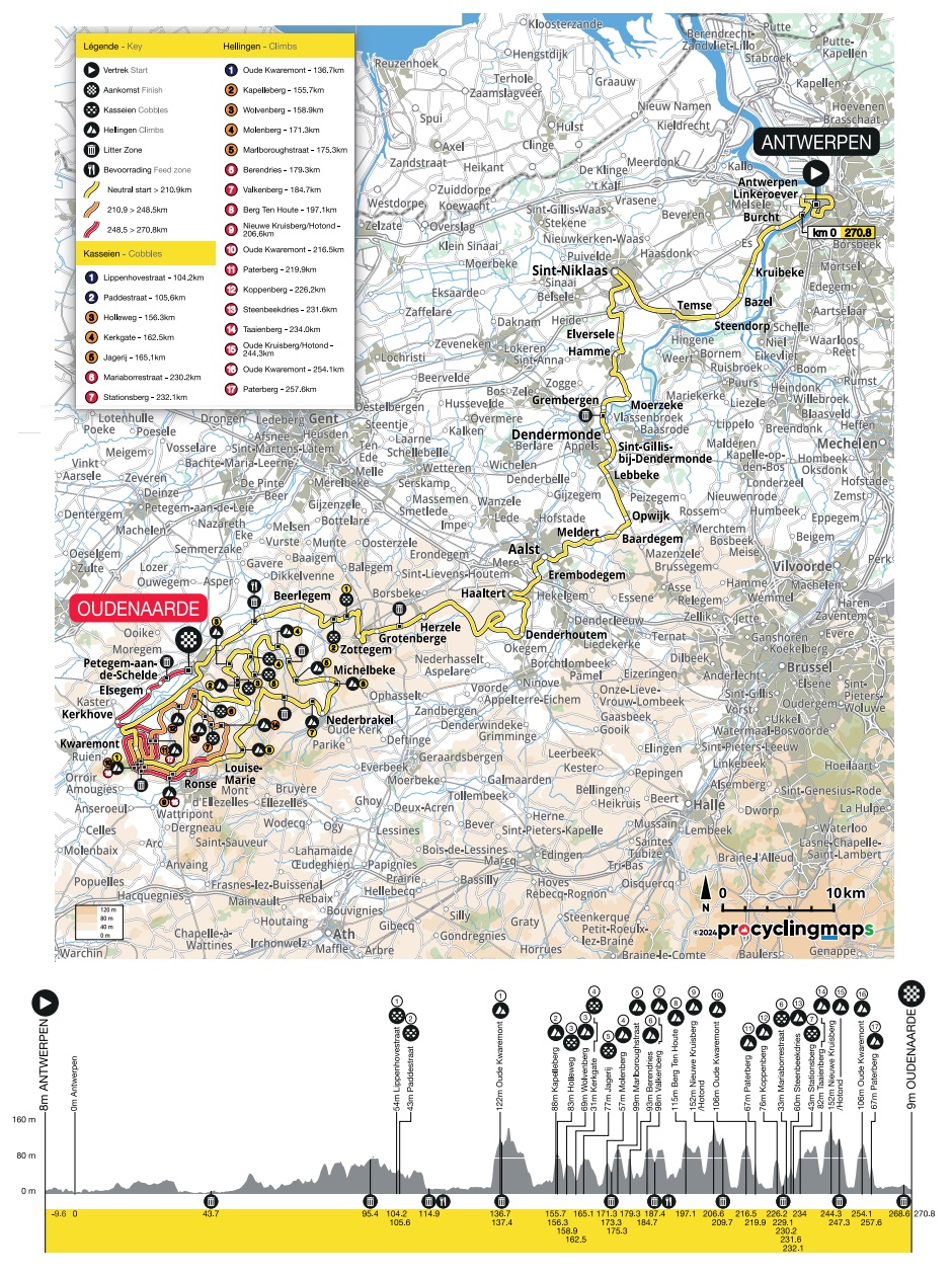 Como decíamos al inicio, el trazado de esta edición es similar al de 2022, saliendo desde Amberes en vez de Brujas, que fue el inicio el año pasado, y concentrando todos los muros en los últimos 140 km, repitiendo los 65 km finales, incluída la meta en Oudenaarde, ya clásicos de las últimas ediciones, si bien con algunos cambios antes de ese tramo final, como la sustitución de Kanarieberg por un paso más por el Kruisberg. En total, 271 km, con 17 cotas oficiales, 12 de ellas adoquinadas, y 7 tramos de pavé llanos.