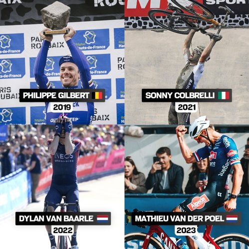 El año pasado -> clasificación / vídeo, se impuso el mencionado Mathieu Van der Poel (Alpecin), llegando en solitario al velódromo de Roubaix para sumar su 2º monumento de la temporada, tras haber ganado unas semanas antes la Milán-San Remo, con su compañero de equipo Jasper Philipsen 2º y Wout Van Aert 3º . El momento clave se produjo en el Carrefour de l’Arbre, cuando un bandazo de Philipsen provocó que Van der Poel cerrara involuntariamente a Degenkolb, que cayó al suelo, abriendo hueco Van Aert … que poco después sufrió un pinchazo, adelántandole Van der Poel y escapándose en busca de la victoria.