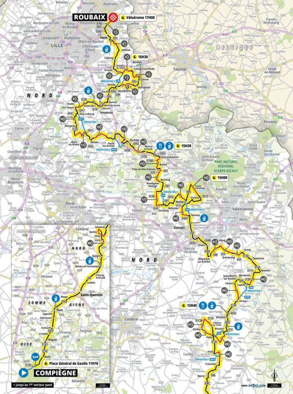 Como decíamos al inicio, el trazado es similar al de años anteriores, repitiéndose de hecho los primeros 110 km de las últimas ediciones, incluídos los 3 primeros tramos de pavé, y toda la ruta desde el km 150 hasta meta, repitiendo también las zonas adoquinadas, si bien en la zona central hay algunos cambios respecto a 2023, con la sustitución de Python por Viesly a Briastre, así como de otros 3 sectores previos a Denain, lo que hace que el nº de tramos adoquinados sea el mismo, 29 (uno de ellos doble), pero sumando más, para un total de casi 56 km sobre pavé, para una distancia completa de 260 km sin contar la neutralizada.