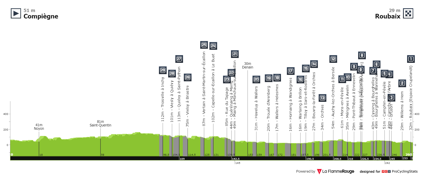 De este modo, y al igual que viene sucediendo desde 1977, la prueba comienza en la localidad de Compiégne, en el departamento de Oise, dirigiéndose inicialmente hacia el noreste, con Saint Quentin como población de paso más importante, y sin dificultades reseñables durante los primeros 95 km, donde lo más probable es que el ritmo sea muy alto buscando la escapada. Poco antes del km 100, ya en el departamento de Nord, llegará el primer tramo adoquinado, el clásico Troisvilles, encadenando poco después 3 sectores en menos de 10 km, destacando el de Quievy a Saint Python por su longitud, siendo uno de los más largos de la prueba, con 3,7 km. Además de su dificultad concreta, estos primeros tramos de pavé suelen ser bastante peligrosos debido al riesgo de montoneras, al haber todavía un pelotón muy numeroso.